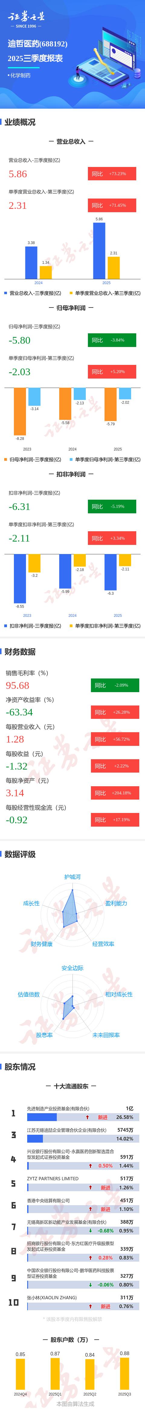 证券之星消息,迪哲医药2025年三季报显示,前三季度公司主营收入5.86亿元,同比上升73.23%;归母净利润-5.8亿元,同比下降3.85%;扣非净利润-6.31亿元,同比下降5.19%;其中2025年第三季度,公司单季度主营收入2.31亿元,同比上升71.46%;单季度归母净利润-2.03亿元,同比上升5.2%;单季度扣非净利润-2.11亿元,同比上升3.35%;负债率51.15%,财务费用2269.98万元,毛利率95.68%。
