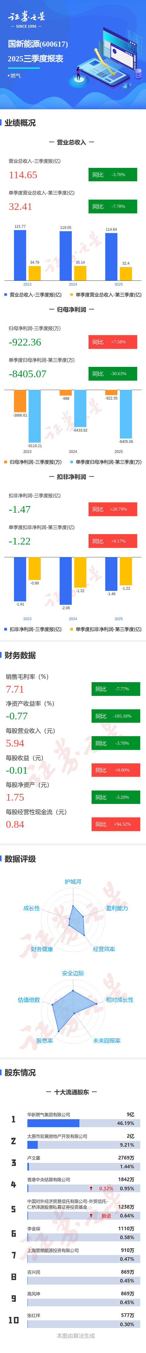证券之星消息,国新能源2025年三季报显示,前三季度公司主营收入114.65亿元,同比下降3.7%;归母净利润-922.36万元,同比上升7.58%;扣非净利润-1.47亿元,同比上升28.8%;其中2025年第三季度,公司单季度主营收入32.41亿元,同比下降7.78%;单季度归母净利润-8405.07万元,同比下降30.64%;单季度扣非净利润-1.22亿元,同比上升8.17%;负债率81.24%,投资收益-3849.45万元,财务费用4.19亿元,毛利率7.71%。
