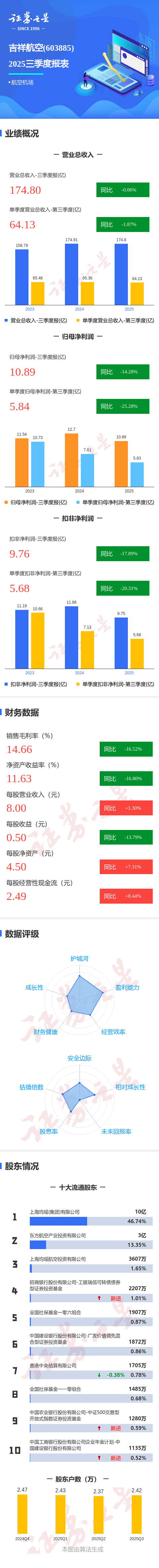 证券之星消息,吉祥航空2025年三季报显示,前三季度公司主营收入174.8亿元,同比下降0.06%;归母净利润10.89亿元,同比下降14.28%;扣非净利润9.76亿元,同比下降17.9%;其中2025年第三季度,公司单季度主营收入64.13亿元,同比下降1.88%;单季度归母净利润5.84亿元,同比下降25.29%;单季度扣非净利润5.68亿元,同比下降20.31%;负债率80.33%,投资收益316.69万元,财务费用7.97亿元,毛利率14.66%。