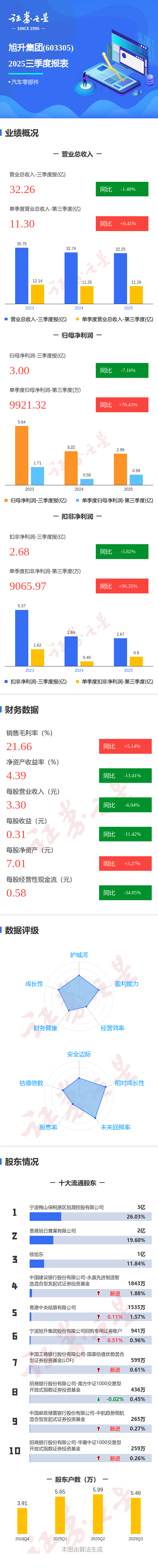 证券之星消息,旭升集团2025年三季报显示,前三季度公司主营收入32.26亿元,同比下降1.48%;归母净利润3.0亿元,同比下降7.16%;扣非净利润2.68亿元,同比下降5.83%;其中2025年第三季度,公司单季度主营收入11.3亿元,同比上升0.41%;单季度归母净利润9921.32万元,同比上升70.43%;单季度扣非净利润9065.97万元,同比上升96.36%;负债率47.33%,投资收益1748.51万元,财务费用2917.73万元,毛利率21.66%。