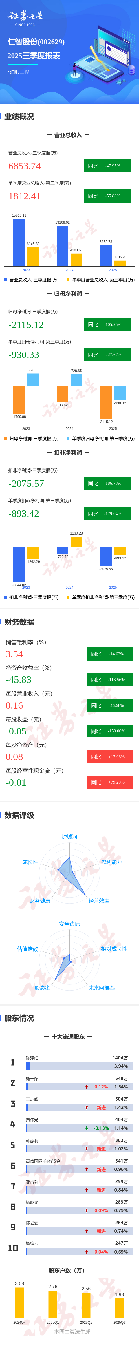 证券之星消息,仁智股份2025年三季报显示,前三季度公司主营收入6853.74万元,同比下降47.95%;归母净利润-2115.12万元,同比下降105.25%;扣非净利润-2075.57万元,同比下降186.79%;其中2025年第三季度,公司单季度主营收入1812.41万元,同比下降55.83%;单季度归母净利润-930.33万元,同比下降227.68%;单季度扣非净利润-893.42万元,同比下降179.04%;负债率80.97%,投资收益-1.87万元,财务费用81.32万元,毛利率3.54%。