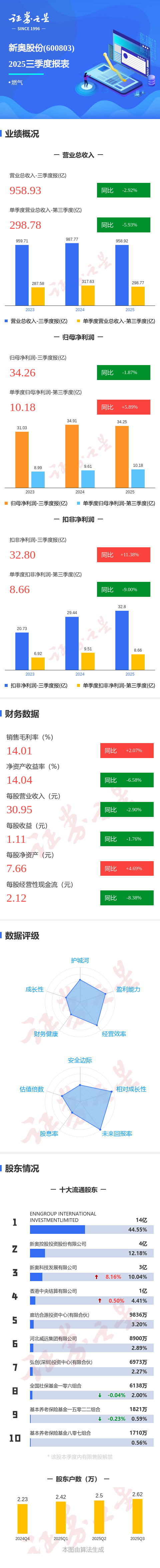 证券之星消息,新奥股份2025年三季报显示,前三季度公司主营收入958.93亿元,同比下降2.92%;归母净利润34.26亿元,同比下降1.87%;扣非净利润32.8亿元,同比上升11.39%;其中2025年第三季度,公司单季度主营收入298.78亿元,同比下降5.94%;单季度归母净利润10.18亿元,同比上升5.89%;单季度扣非净利润8.66亿元,同比下降9.01%;负债率54.84%,投资收益11.21亿元,财务费用4.13亿元,毛利率14.01%。