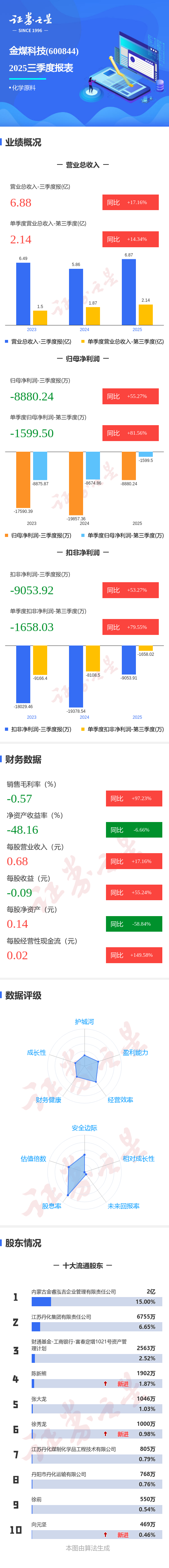 证券之星消息,金煤科技2025年三季报显示,前三季度公司主营收入6.88亿元,同比上升17.17%;归母净利润-8880.24万元,同比上升55.28%;扣非净利润-9053.92万元,同比上升53.28%;其中2025年第三季度,公司单季度主营收入2.14亿元,同比上升14.34%;单季度归母净利润-1599.5万元,同比上升81.56%;单季度扣非净利润-1658.03万元,同比上升79.55%;负债率79.39%,投资收益-99.86万元,财务费用1671.44万元,毛利率-0.57%。