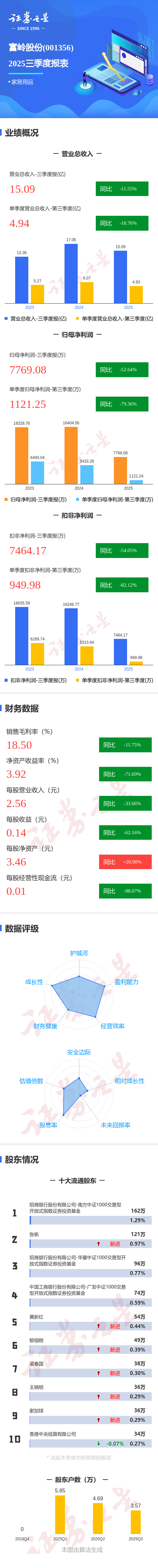 证券之星消息,富岭股份2025年三季报显示,前三季度公司主营收入15.09亿元,同比下降11.55%;归母净利润7769.08万元,同比下降52.64%;扣非净利润7464.17万元,同比下降54.06%;其中2025年第三季度,公司单季度主营收入4.94亿元,同比下降18.76%;单季度归母净利润1121.25万元,同比下降79.36%;单季度扣非净利润949.98万元,同比下降82.12%;负债率18.47%,投资收益179.33万元,财务费用861.77万元,毛利率18.5%。