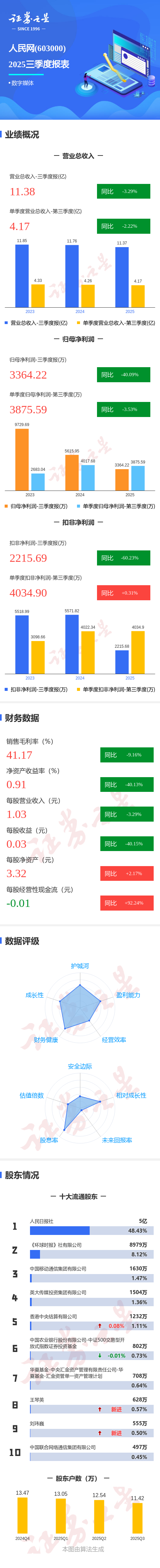 证券之星消息,人民网2025年三季报显示,前三季度公司主营收入11.38亿元,同比下降3.29%;归母净利润3364.22万元,同比下降40.1%;扣非净利润2215.69万元,同比下降60.23%;其中2025年第三季度,公司单季度主营收入4.17亿元,同比下降2.22%;单季度归母净利润3875.59万元,同比下降3.54%;单季度扣非净利润4034.9万元,同比上升0.31%;负债率23.05%,投资收益2355.19万元,财务费用-691.17万元,毛利率41.17%。