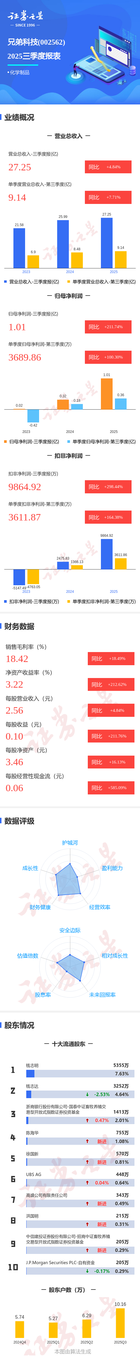 证券之星消息,兄弟科技2025年三季报显示,前三季度公司主营收入27.25亿元,同比上升4.84%;归母净利润1.01亿元,同比上升211.75%;扣非净利润9864.92万元,同比上升298.45%;其中2025年第三季度,公司单季度主营收入9.14亿元,同比上升7.71%;单季度归母净利润3689.86万元,同比上升100.3%;单季度扣非净利润3611.87万元,同比上升164.39%;负债率42.72%,投资收益-12.94万元,财务费用4488.62万元,毛利率18.42%。
