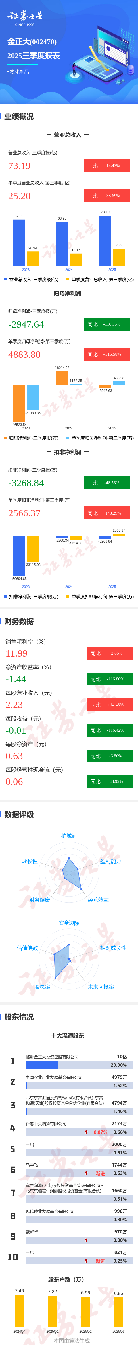 证券之星消息,金正大2025年三季报显示,前三季度公司主营收入73.19亿元,同比上升14.44%;归母净利润-2947.64万元,同比下降116.36%;扣非净利润-3268.84万元,同比下降48.56%;其中2025年第三季度,公司单季度主营收入25.2亿元,同比上升38.7%;单季度归母净利润4883.8万元,同比上升316.58%;单季度扣非净利润2566.37万元,同比上升148.29%;负债率81.72%,投资收益-431.07万元,财务费用7653.32万元,毛利率11.99%。