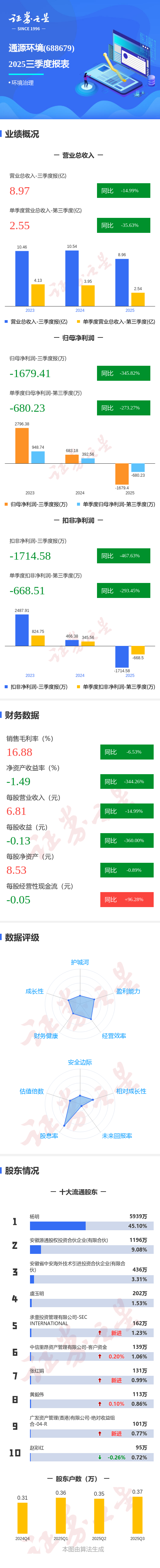 证券之星消息,通源环境2025年三季报显示,前三季度公司主营收入8.97亿元,同比下降15.0%;归母净利润-1679.41万元,同比下降345.82%;扣非净利润-1714.58万元,同比下降467.63%;其中2025年第三季度,公司单季度主营收入2.55亿元,同比下降35.63%;单季度归母净利润-680.23万元,同比下降273.28%;单季度扣非净利润-668.51万元,同比下降293.45%;负债率59.59%,投资收益-801.18万元,财务费用995.11万元,毛利率16.88%。