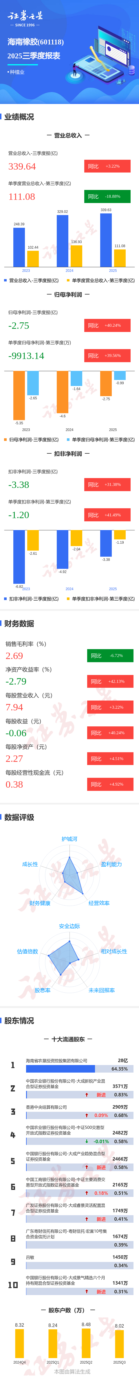 证券之星消息,海南橡胶2025年三季报显示,前三季度公司主营收入339.64亿元,同比上升3.23%;归母净利润-2.75亿元,同比上升40.24%;扣非净利润-3.38亿元,同比上升31.39%;其中2025年第三季度,公司单季度主营收入111.08亿元,同比下降18.88%;单季度归母净利润-9913.14万元,同比上升39.56%;单季度扣非净利润-1.2亿元,同比上升41.49%;负债率67.85%,投资收益746.54万元,财务费用4.91亿元,毛利率2.69%。