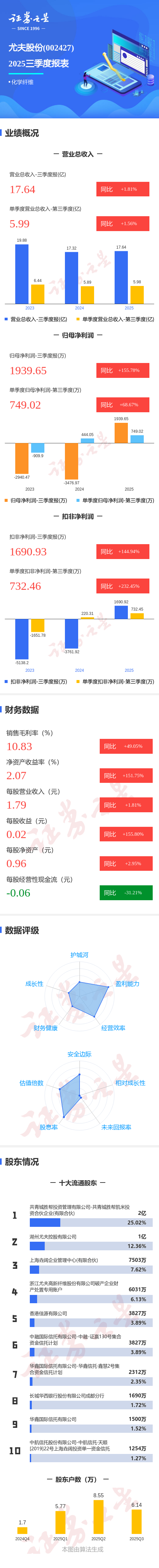 证券之星消息,尤夫股份2025年三季报显示,前三季度公司主营收入17.64亿元,同比上升1.82%;归母净利润1939.65万元,同比上升155.79%;扣非净利润1690.93万元,同比上升144.95%;其中2025年第三季度,公司单季度主营收入5.99亿元,同比上升1.57%;单季度归母净利润749.02万元,同比上升68.68%;单季度扣非净利润732.46万元,同比上升232.46%;负债率61.54%,财务费用2092.12万元,毛利率10.83%。