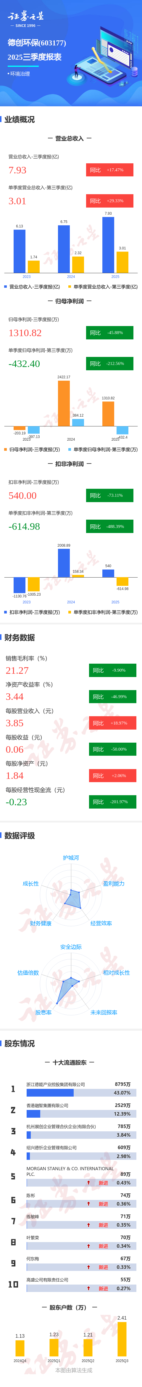 证券之星消息,德创环保2025年三季报显示,前三季度公司主营收入7.93亿元,同比上升17.48%;归母净利润1310.82万元,同比下降45.88%;扣非净利润540.0万元,同比下降73.12%;其中2025年第三季度,公司单季度主营收入3.01亿元,同比上升29.34%;单季度归母净利润-432.4万元,同比下降212.57%;单季度扣非净利润-614.98万元,同比下降488.39%;负债率79.63%,投资收益-920.48万元,财务费用2825.41万元,毛利率21.27%。