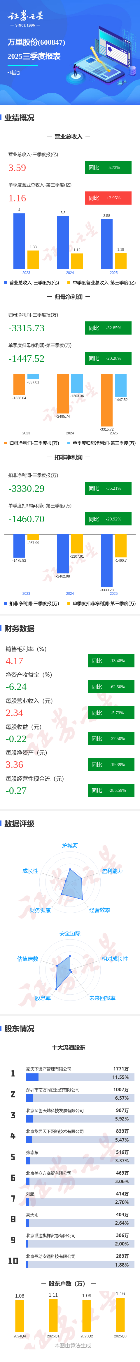 证券之星消息,万里股份2025年三季报显示,前三季度公司主营收入3.59亿元,同比下降5.74%;归母净利润-3315.73万元,同比下降32.85%;扣非净利润-3330.29万元,同比下降35.21%;其中2025年第三季度,公司单季度主营收入1.16亿元,同比上升2.95%;单季度归母净利润-1447.52万元,同比下降20.29%;单季度扣非净利润-1460.7万元,同比下降20.93%;负债率8.84%,财务费用-7.57万元,毛利率4.17%。