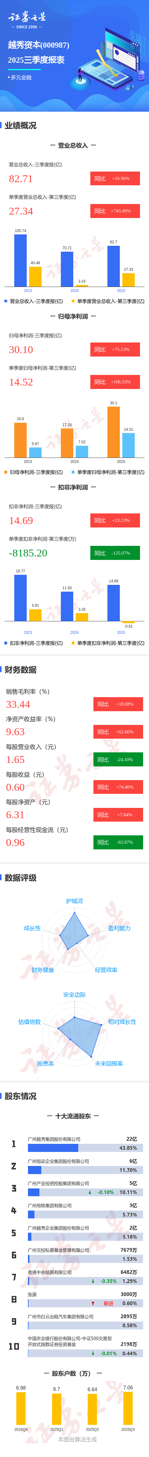 证券之星消息,越秀资本2025年三季报显示,前三季度公司主营收入82.71亿元,同比上升16.96%;归母净利润30.1亿元,同比上升75.13%;扣非净利润14.69亿元,同比上升23.14%;其中2025年第三季度,公司单季度主营收入27.34亿元,同比上升743.5%;单季度归母净利润14.52亿元,同比上升106.53%;单季度扣非净利润-8185.2万元,同比下降125.08%;负债率77.17%,投资收益38.75亿元,财务费用1.79亿元,毛利率33.44%。