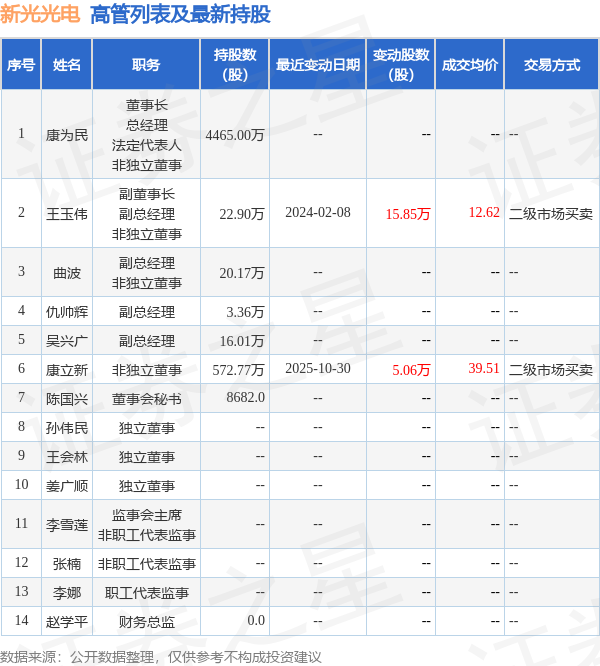 新光光电近半年内的董监高及核心技术人员增减持详情如下: