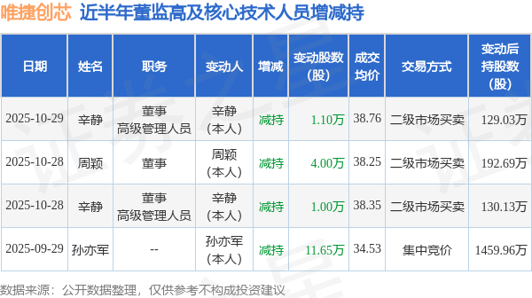 证券之星消息,根据10月30日市场公开信息、上市公司公告及交易所披露数据整理,唯捷创芯(688153)最新董监高及相关人员股份变动情况:2025年10月29日公司董事,高级管理人员辛静共减持公司股份1.1万股,占公司总股本为0.0026%。变动期间公司股价上涨2.75%,10月29日当日收盘报38.5元。