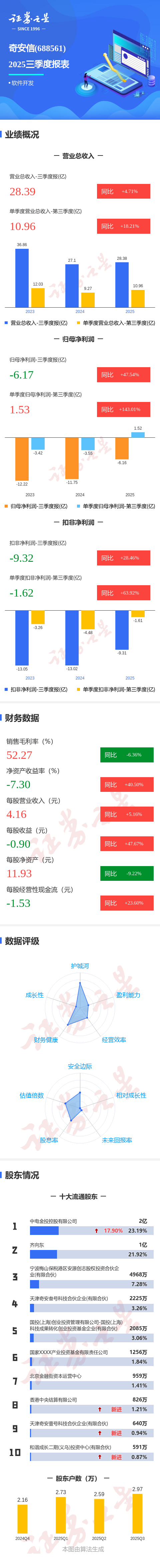 证券之星消息,奇安信2025年三季报显示,前三季度公司主营收入28.39亿元,同比上升4.72%;归母净利润-6.17亿元,同比上升47.54%;扣非净利润-9.32亿元,同比上升28.47%;其中2025年第三季度,公司单季度主营收入10.96亿元,同比上升18.22%;单季度归母净利润1.53亿元,同比上升143.01%;单季度扣非净利润-1.62亿元,同比上升63.93%;负债率44.55%,投资收益-3205.25万元,财务费用5566.02万元,毛利率52.27%。
