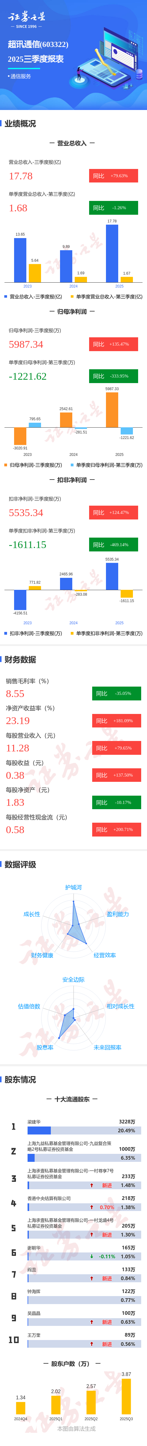 证券之星消息,超讯通信2025年三季报显示,前三季度公司主营收入17.78亿元,同比上升79.63%;归母净利润5987.34万元,同比上升135.48%;扣非净利润5535.34万元,同比上升124.47%;其中2025年第三季度,公司单季度主营收入1.68亿元,同比下降1.26%;单季度归母净利润-1221.62万元,同比下降333.95%;单季度扣非净利润-1611.15万元,同比下降469.15%;负债率85.56%,投资收益373.53万元,财务费用300.89万元,毛利率8.55%。