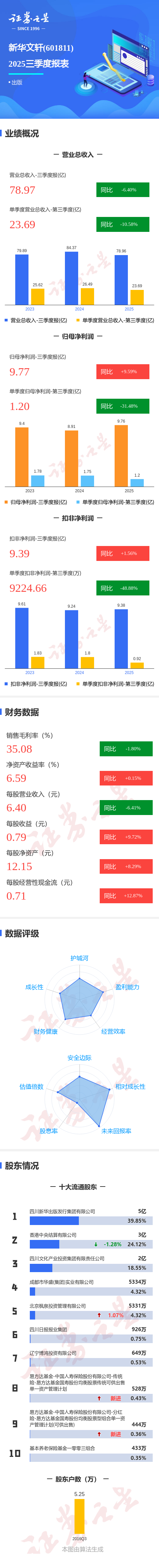 证券之星消息,新华文轩2025年三季报显示,前三季度公司主营收入78.97亿元,同比下降6.41%;归母净利润9.77亿元,同比上升9.6%;扣非净利润9.39亿元,同比上升1.57%;其中2025年第三季度,公司单季度主营收入23.69亿元,同比下降10.58%;单季度归母净利润1.2亿元,同比下降31.49%;单季度扣非净利润9224.66万元,同比下降48.88%;负债率38.15%,投资收益1.1亿元,财务费用-1.59亿元,毛利率35.08%。