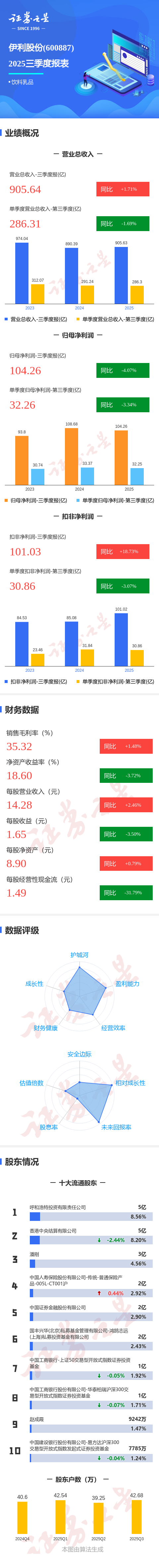 证券之星消息,伊利股份2025年三季报显示,前三季度公司主营收入905.64亿元,同比上升1.71%;归母净利润104.26亿元,同比下降4.07%;扣非净利润101.03亿元,同比上升18.73%;其中2025年第三季度,公司单季度主营收入286.31亿元,同比下降1.7%;单季度归母净利润32.26亿元,同比下降3.35%;单季度扣非净利润30.86亿元,同比下降3.08%;负债率60.55%,投资收益1.74亿元,财务费用-7.59亿元,毛利率35.32%。