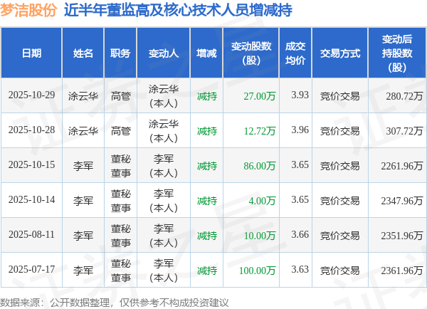 证券之星消息,根据10月30日市场公开信息、上市公司公告及交易所披露数据整理,梦洁股份(002397)最新董监高及相关人员股份变动情况:2025年10月29日公司高管涂云华共减持公司股份27.0万股,占公司总股本为0.0361%。变动期间公司股价下跌0.25%,10月29日当日收盘报3.95元。