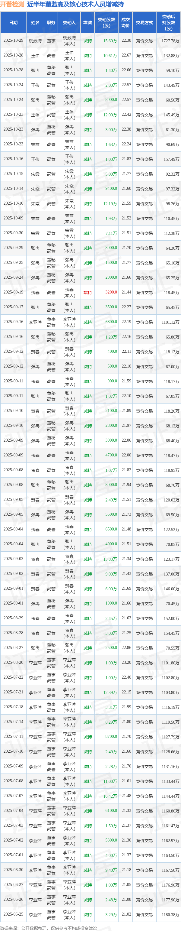 开普检测近半年内的董监高及核心技术人员增减持详情如下: