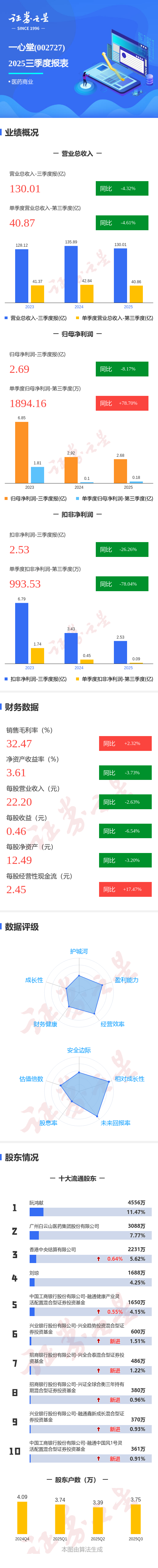 证券之星消息,一心堂2025年三季报显示,前三季度公司主营收入130.01亿元,同比下降4.33%;归母净利润2.69亿元,同比下降8.17%;扣非净利润2.53亿元,同比下降26.27%;其中2025年第三季度,公司单季度主营收入40.87亿元,同比下降4.62%;单季度归母净利润1894.16万元,同比上升78.71%;单季度扣非净利润993.53万元,同比下降78.04%;负债率52.85%,投资收益-133.33万元,财务费用8478.25万元,毛利率32.47%。