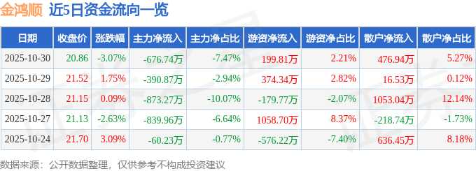 证券之星消息,截至2025年10月30日收盘,金鸿顺(603922)报收于20.86元,下跌3.07%,换手率2.39%,成交量4.28万手,成交额9058.32万元。