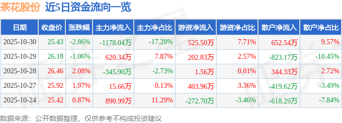 证券之星消息,截至2025年10月30日收盘,茶花股份(603615)报收于25.43元,下跌2.86%,换手率1.1%,成交量2.66万手,成交额6817.5万元。
