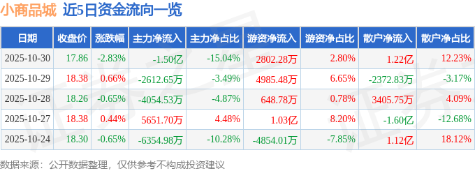 10月30日的资金流向数据方面,主力资金净流出1.5亿元,占总成交额15.04%,游资资金净流入2802.28万元,占总成交额2.8%,散户资金净流入1.22亿元,占总成交额12.23%。