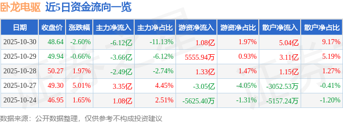 证券之星消息,截至2025年10月30日收盘,卧龙电驱(600580)报收于48.64元,下跌2.6%,换手率7.12%,成交量111.18万手,成交额54.98亿元。