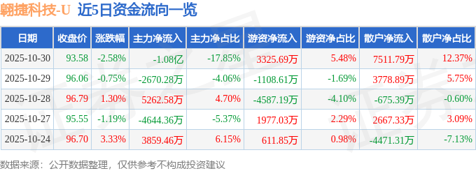 10月30日的资金流向数据方面,主力资金净流出1.08亿元,占总成交额17.85%,游资资金净流入3325.69万元,占总成交额5.48%,散户资金净流入7511.79万元,占总成交额12.37%。