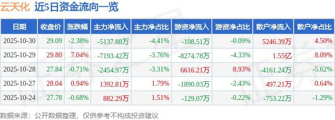 证券之星消息,截至2025年10月30日收盘,云天化(600096)报收于29.09元,下跌2.38%,换手率2.19%,成交量39.87万手,成交额11.65亿元。