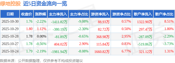 证券之星消息,截至2025年10月30日收盘,绿地控股(600606)报收于1.76元,下跌2.22%,换手率0.62%,成交量87.6万手,成交额1.56亿元。