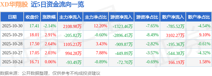 证券之星消息,截至2025年10月30日收盘,XD华翔股(603112)报收于17.41元,下跌2.14%,换手率1.95%,成交量9.85万手,成交额1.73亿元。