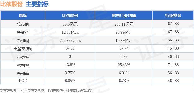 比依股份2025年三季报显示,前三季度公司主营收入17.56亿元,同比上升18.66%;归母净利润7220.44万元,同比下降29.0%;扣非净利润6612.84万元,同比下降33.39%;其中2025年第三季度,公司单季度主营收入5.98亿元,同比下降3.4%;单季度归母净利润1849.22万元,同比下降45.08%;单季度扣非净利润1724.17万元,同比下降47.15%;负债率61.63%,投资收益644.82万元,财务费用-256.71万元,毛利率13.8%。比依股份(603215)主营业务:智能小家电产品的研发、设计、制造和销售。