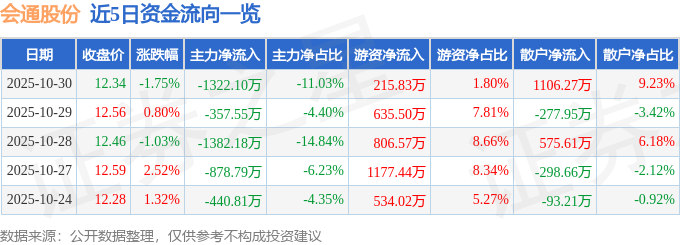 证券之星消息,截至2025年10月30日收盘,会通股份(688219)报收于12.34元,下跌1.75%,换手率1.74%,成交量9.58万手,成交额1.2亿元。