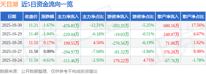 证券之星消息,截至2025年10月30日收盘,天目湖(603136)报收于11.21元,下跌1.67%,换手率1.27%,成交量3.42万手,成交额3873.61万元。
