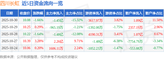 证券之星消息,截至2025年10月30日收盘,四川长虹(600839)报收于10.08元,下跌1.66%,换手率2.02%,成交量93.28万手,成交额9.46亿元。