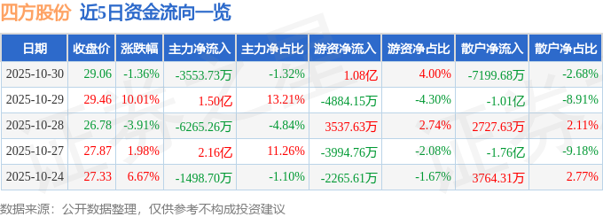 证券之星消息,截至2025年10月30日收盘,四方股份(601126)报收于29.06元,下跌1.36%,换手率11.07%,成交量90.75万手,成交额26.9亿元。