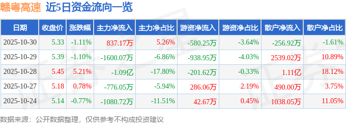 证券之星消息,截至2025年10月30日收盘,赣粤高速(600269)报收于5.33元,下跌1.11%,换手率1.28%,成交量29.8万手,成交额1.59亿元。