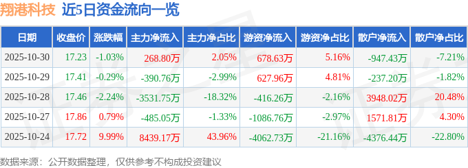 证券之星消息,截至2025年10月30日收盘,翔港科技(603499)报收于17.23元,下跌1.03%,换手率2.49%,成交量7.54万手,成交额1.31亿元。