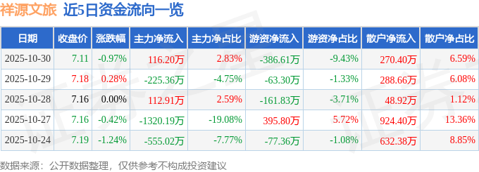 证券之星消息,截至2025年10月30日收盘,祥源文旅(600576)报收于7.11元,下跌0.97%,换手率0.87%,成交量5.75万手,成交额4100.8万元。