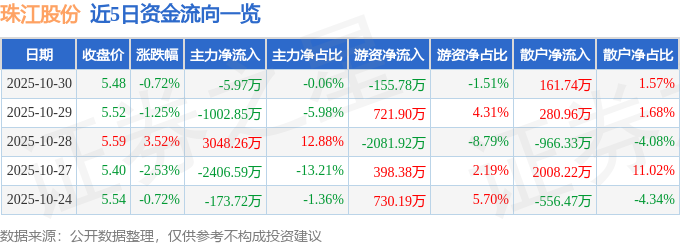 证券之星消息,截至2025年10月30日收盘,珠江股份(600684)报收于5.48元,下跌0.72%,换手率2.21%,成交量18.83万手,成交额1.03亿元。