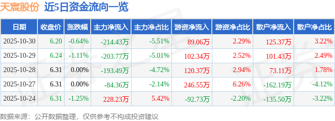 证券之星消息,截至2025年10月30日收盘,天宸股份(600620)报收于6.2元,下跌0.64%,换手率0.91%,成交量6.25万手,成交额3894.86万元。