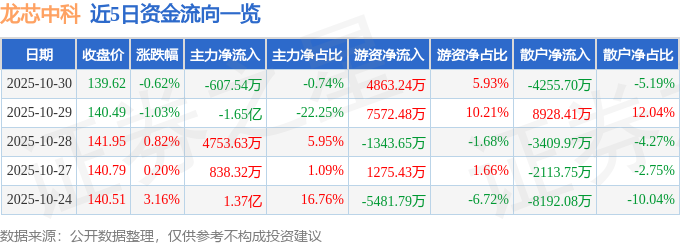 10月30日的资金流向数据方面,主力资金净流出607.54万元,占总成交额0.74%,游资资金净流入4863.24万元,占总成交额5.93%,散户资金净流出4255.7万元,占总成交额5.19%。