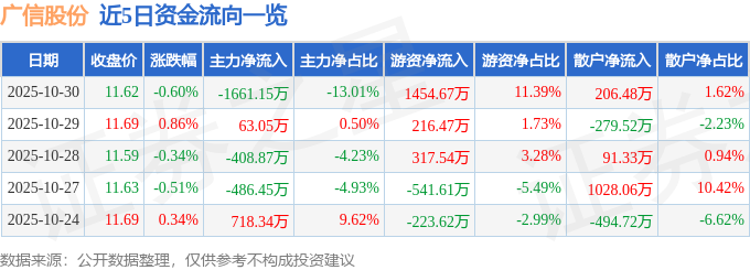证券之星消息,截至2025年10月30日收盘,广信股份(603599)报收于11.62元,下跌0.6%,换手率1.21%,成交量11.01万手,成交额1.28亿元。