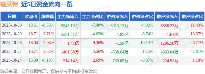 证券之星消息,截至2025年10月30日收盘,福莱特(601865)报收于18.61元,下跌0.53%,换手率2.1%,成交量39.88万手,成交额7.49亿元。