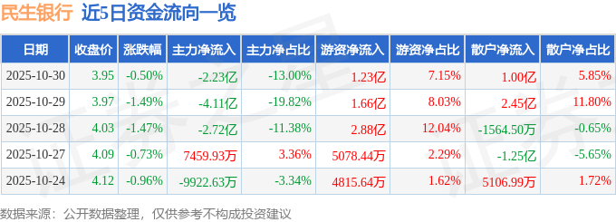 证券之星消息,截至2025年10月30日收盘,民生银行(600016)报收于3.95元,下跌0.5%,换手率1.22%,成交量431.6万手,成交额17.14亿元。