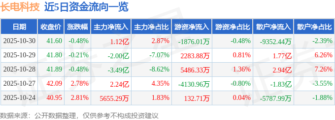 证券之星消息,截至2025年10月30日收盘,长电科技(600584)报收于41.6元,下跌0.48%,换手率5.19%,成交量92.84万手,成交额39.08亿元。