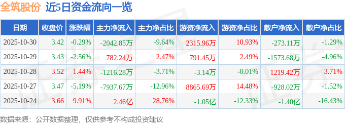 证券之星消息,截至2025年10月30日收盘,全筑股份(603030)报收于3.42元,下跌0.29%,换手率4.71%,成交量62.02万手,成交额2.12亿元。